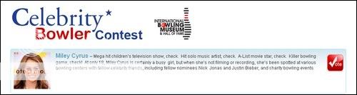 La pagina web GoBowling.com ha organizado un concurso en el que los fans pueden votar a las mejores estrellas del bowling. Entre ellas se encuentra nuestra querida Miley, otras de las estrellas que comparten este concurso con ella son: Justin Bieber, Kim Kardashian, Nick y Joe Jonas, Lady Gaga, entre otros. A continuación te dejamos lo que dicen de ella: